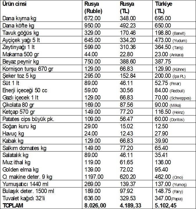 - Listede birinci sütunda Rusya fiyatları ruble cinsinden, ikinci sütunda Rusya fiyatları TL cinsinden, üçüncü sütunda da Türkiye fiyatları yer almaktadır. Alışveriş günündeki kurdan 1 TL= 1.93 ruble, 1 dolar= 79,50 ruble’